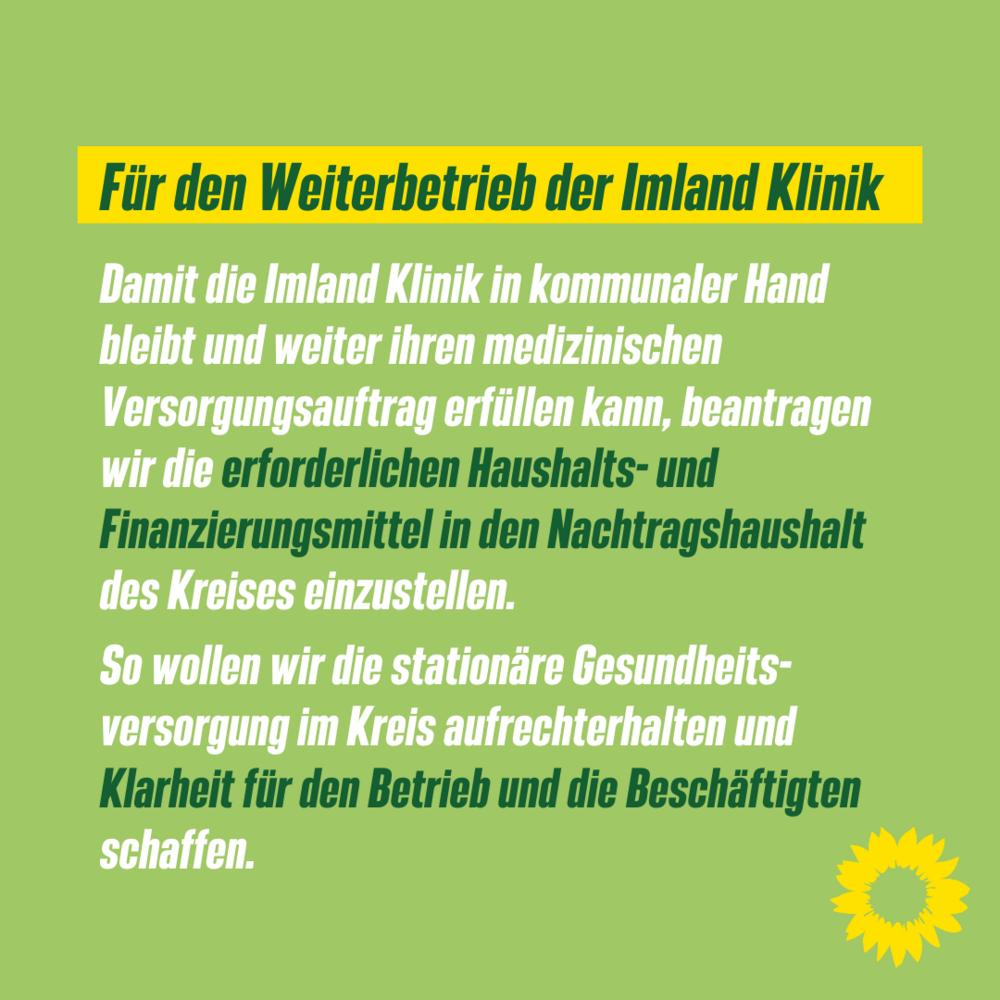 Der Kreis ist für die Aufrechterhaltung der stationären Krankenhausversorgung in Form der Grund- und Regelversorgung verantwortlich. Aus der Verantwortung heraus muss der Kreis seine Handlungsfähigkeit wieder erlangen. Das geht nur, wenn im Kreishaushalt Mittel bereit gestellt werden, um die Imland Klinik in kommunaler Hand fortzuführen.