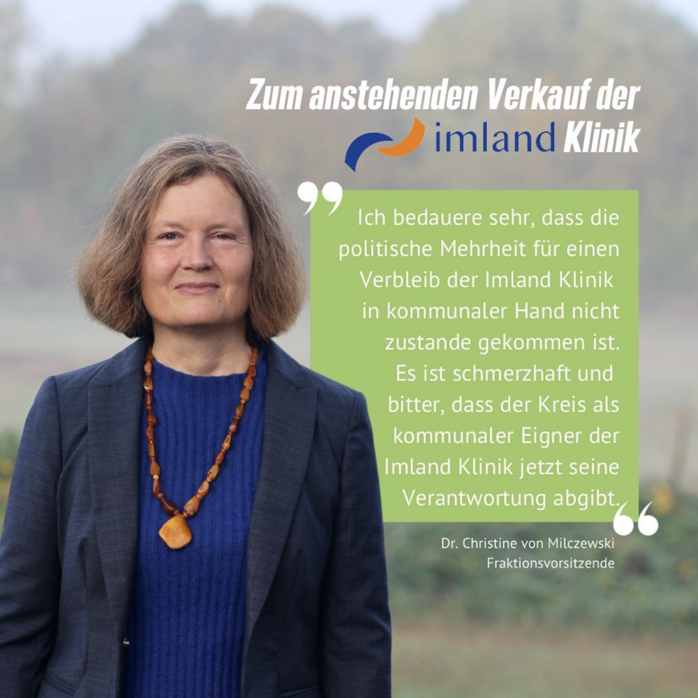Die Imland Klinik übernimmt für den Kreis den wichtigen Auftrag der stationären Krankenhausversorgung. Die medizinische Grund- und Regelversorgung mit stationären Krankenhausleistungen ist und bleibt nach dem Gesetz Aufgabe des Kreises. Gerade deswegen waren wir dafür, dass der Kreis seinen Einfluss und sein Eigentum an der Klinik behält.
