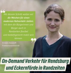 „Mit diesem Schritt wollen wir die Weichen für einen modernen Nahverkehr stellen, mit dem die Bürgerinnen und Bürger auch in Randzeiten flexibel und bedarfsgerecht mobil sein können. On-Demand-Verkehre können in Städten in Randzeiten einen wichtigen Beitrag zur Mobilität leisten.", so Kirsten Zülsdorff, unsere Fraktionsvorsitzende.