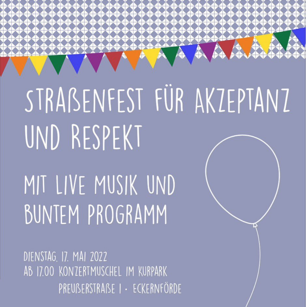 Der Runde Tisch für Akzeptanz und Respekt des Kreises Rendsburg-Eckernförde veranstaltet am Dienstag, 17. Mai ein buntes Festmit Kinderchor, Live-Band, Schminkstand und vielem mehr! Los geht es um 17 Uhr in der Konzertmuschel Eckernförde.